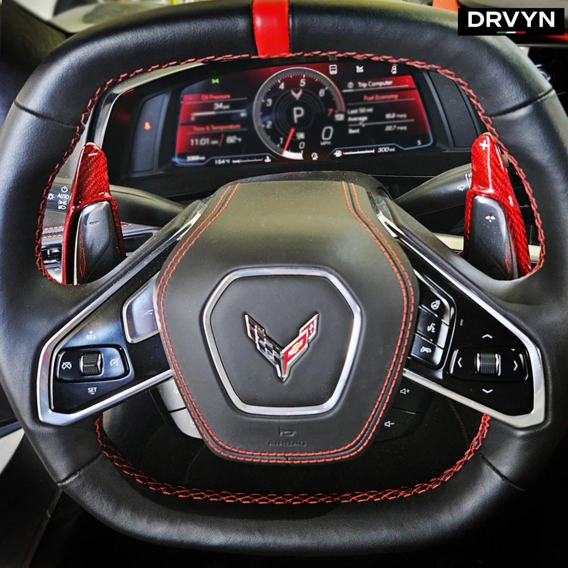 Redefine your Corvette C8 driving experience with the DRVYN Red Carbon Fiber Steering Wheel Paddle Shifter Extension Kit, a perfect blend of performance focused control and premium cockpit styling. Crafted from real red carbon fiber and precision shaped to match OEM paddles, these extensions deliver a larger, closer shift surface for quicker, more confident gear changes. Finished in high gloss to showcase deep weave clarity, they add a bold motorsport accent that elevates every drive.